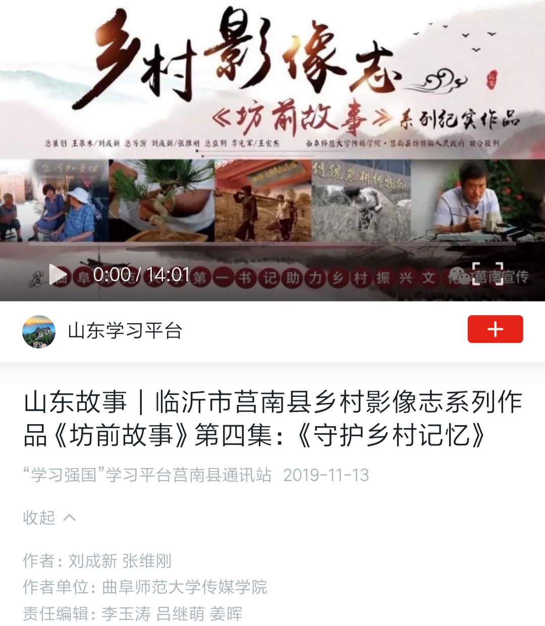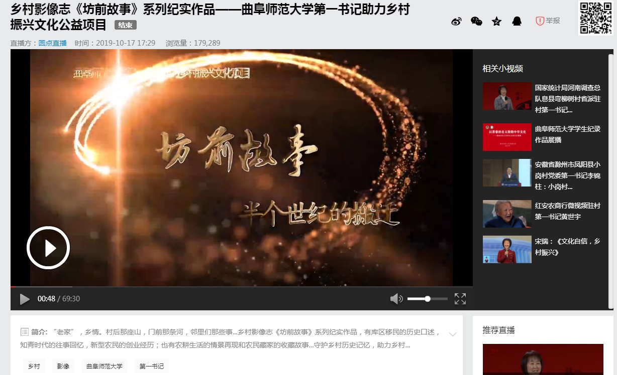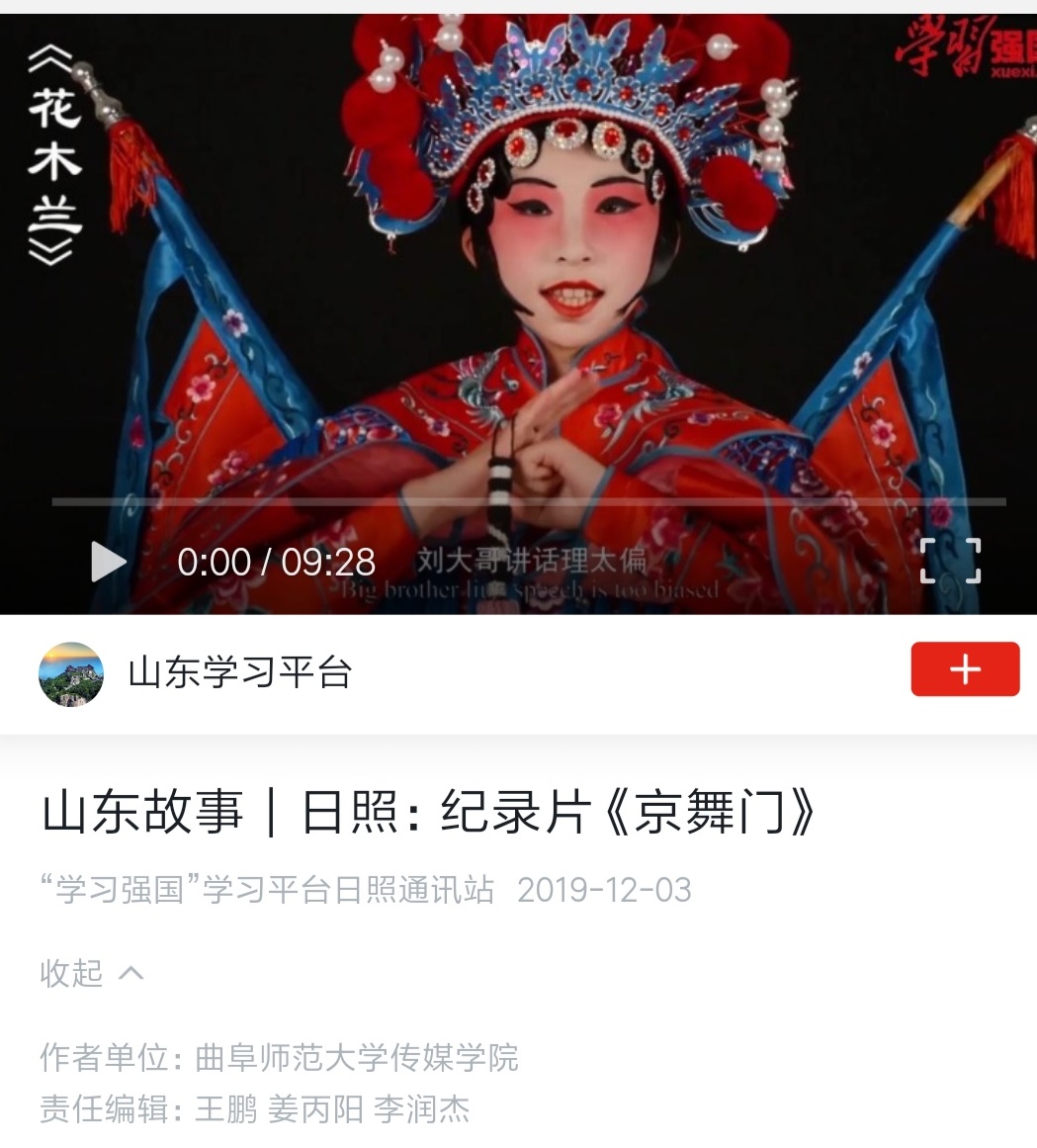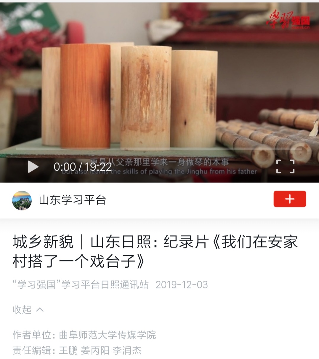 在实践中厚植爱国情怀,用镜头和影像投身文化扶贫和乡村服务中。在刘成新、张维刚两位老师的指导下,学院师生拍摄的乡村影像志系列作品《坊前故事》6集在学习强国平台以“山东故事”专题全集发布展播,该作品同时在“人民网”视频频道和《求是》杂志社主管的“圆点直播”等多家新媒体平台发布展播。由赵鑫老师指导的纪录片《我们在安家村搭了一个戏台子》《京舞门》分别在学习学强国 “城乡新貌”和“山东故事”专题展播。统计数据显示,上述作品在相关平台已经有十多万次播放量,在社会上产生了比较广泛的反响。