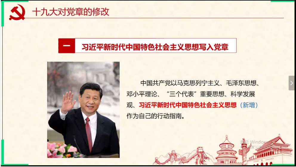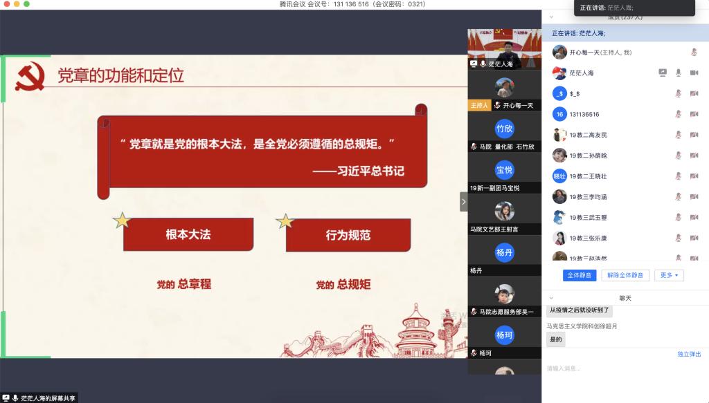 本次会议内容共分三个板块,围绕“学新党章,做合格党员”进行讲述。会议伊始,路吉庆就第一个板块“党章的概述”进行了详细解读,分别介绍了党章的概念、功能、定位及党章体系的简要进化历程。随后,路吉庆提到十九大对党章做出的十个修改,并对其进行了简要说明。路吉庆分别对九条新条例进行了扩充解释,并结合基本国情以及现状阐述了旧条例修改的原因,且在此过程中,与线上学生干部积极互动交流,使其加深会议内容理解。最后,路吉庆指出,一名合格党员最基本的要求就是要做到深入学习党章、时刻牢记党章、深入实践党章。他还就如何学习和践行党章这个问题进行了讲解。路吉庆强调,学生干部在向党员迈步的过程中,要落实学、思、践、悟四个步骤,即深入细致地学习党章,深入思考、将党章融会贯通,深入实践、落实利用党章指导学习与工作,深入感悟党章、增强党性。