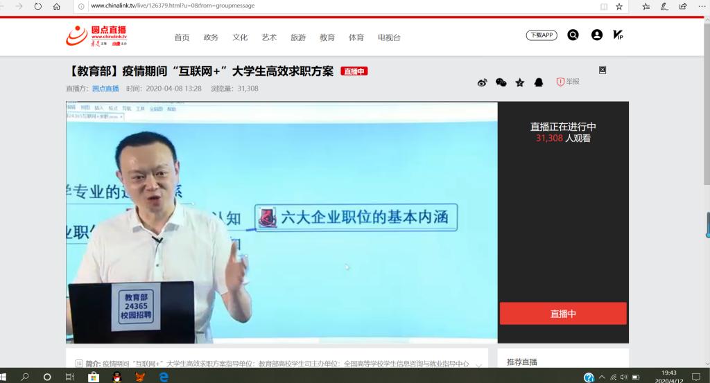 积极响应教育部号召,组织学院应届毕业生观看由教育部组织开展的24365校园招聘服务互联网+就业公益直播课,本次直播课由万学教育董事长张锐博士担任主讲。