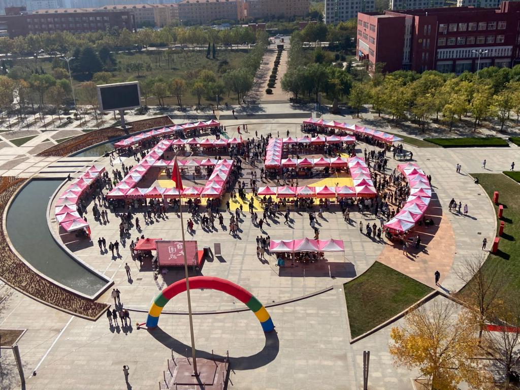 活动以“学至六五,集至百团”为主题,现场89顶社团纳新帐篷摆成了“65”图案,旨在庆祝曲师建校65周年,表达美好祝愿。本次足球在线直播