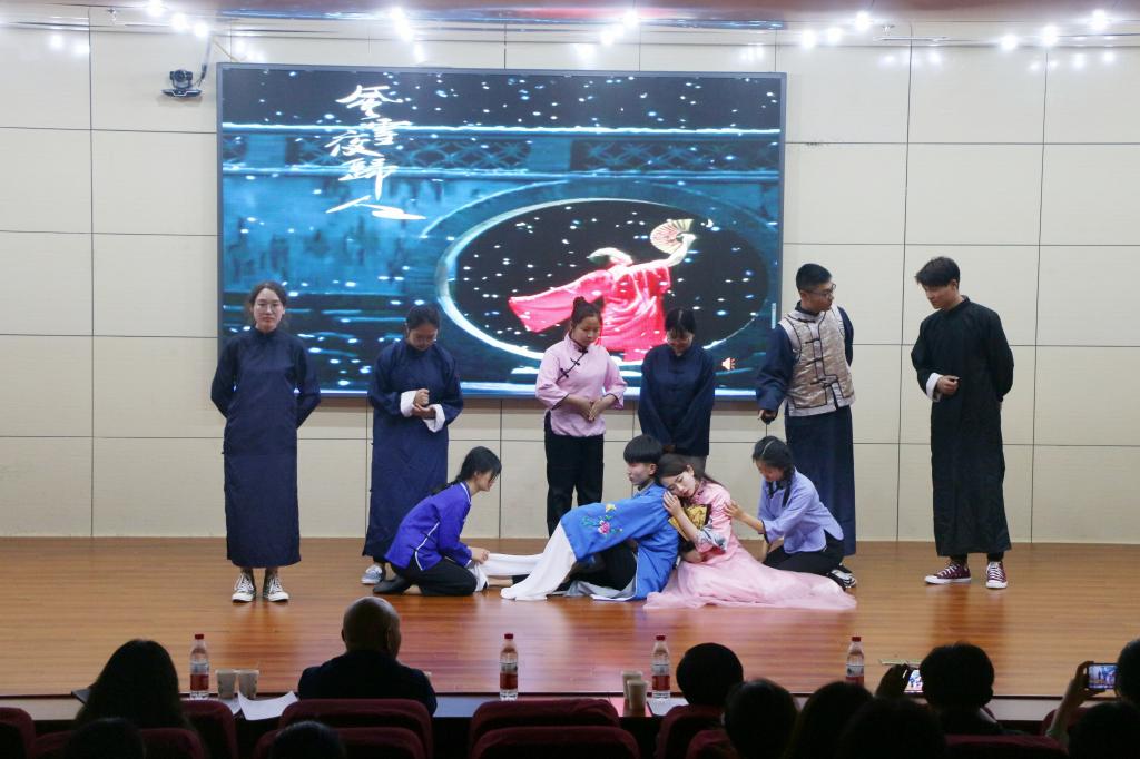舞蹈队带来舞蹈《金陵十三钗》后,话剧汇演正式拉开帷幕。新闻二班和新闻一班分别演绎的《风雪夜归人》,讲述了民国梨园带给达官贵人的戏剧声色,赞扬了梨园戏子反抗封建牢笼的精神。新闻三班带来的《上海屋檐下》通过对生活在上海的小人物的悲惨遭遇和喜怒哀乐的演绎,揭露了国民党统治下的黑暗现实。《北京人》以一个典型的没落士大夫家庭的经济衰落为背景,由新闻一班的同学共同演绎,体现了家庭中善与恶的冲突。新闻三班演绎的另一部话剧《滚滚红尘》,极具感情纠葛,家国利益与个人情感的激烈碰撞,让人印象深刻。汇演结束之后,王成一老师进行了重要点评,肯定了同学们的努力付出。