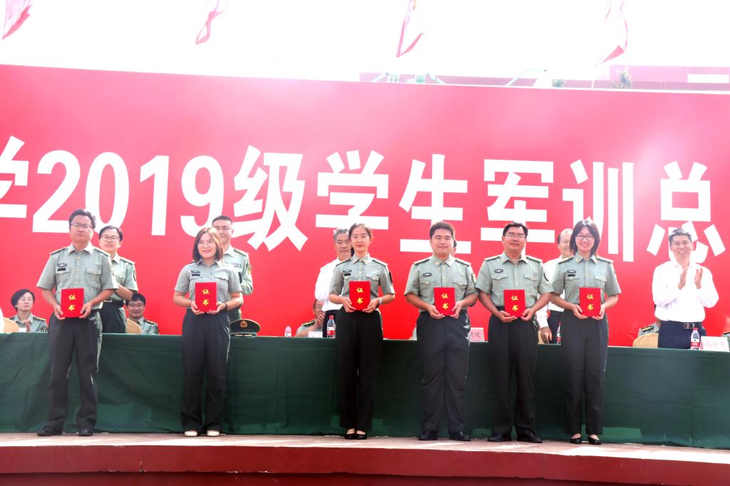 荣获军训工作优秀单位、内务卫生优秀单位及优秀连队三个奖项,我院2019级辅导员乔希荣获优秀指导员称号,部分同学荣获优秀标兵称号。在主席台就坐的领导为获奖代表颁发证书。