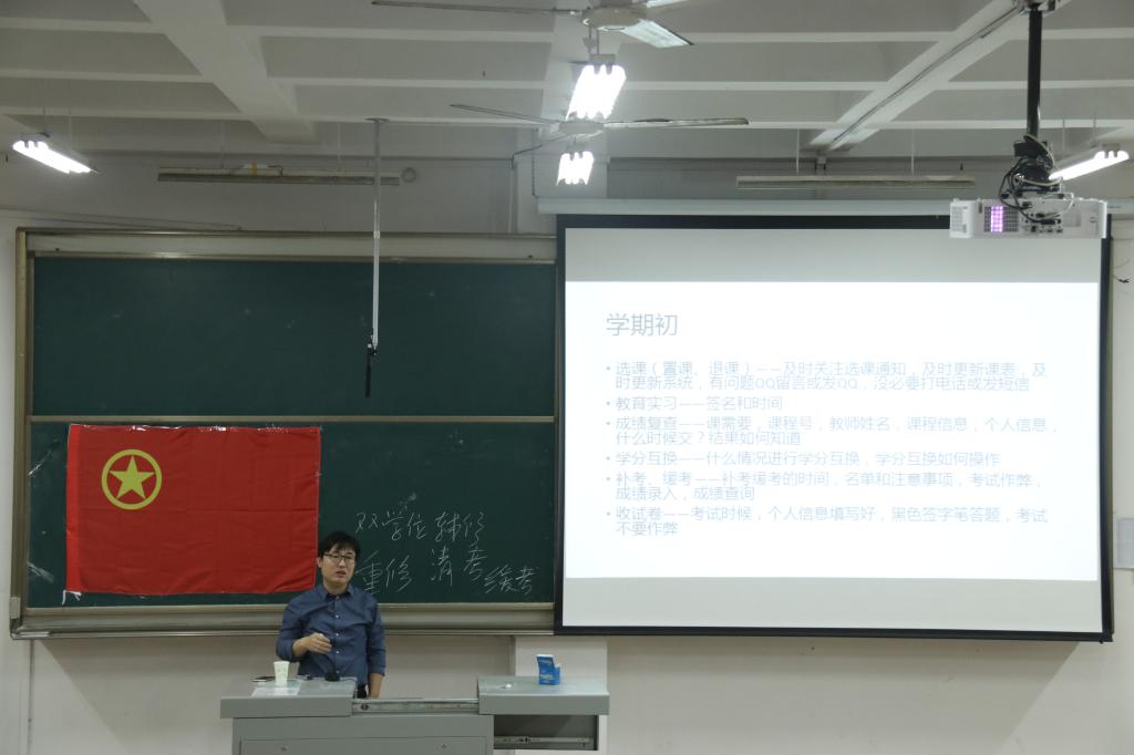 会议伊始,学生会监察部对学生干部出勤情况进行了核查,保证会议的有序进行。接下来,张洪孟发表讲话。他首先就与教务咨询群有关的内容进行了说明,并强调2018级同学要学会使用教务系统APP和PC端,同时介绍了教务系统的多种功能。接着,张老师详细解释了免修、重修、学分制、清考缓考的含义,并特别说明了转专业和辅修会面临的问题。在本次会议中,张老师着重强调“要在规定时间内干规定的事”。他还指出班干部要重视学习、明确责任、不忘初心,并通过院校优秀学子的事迹来激励学生干部不断进取,为学生干部们如何合理安排学习与工作之间的关系提出了宝贵的意见。