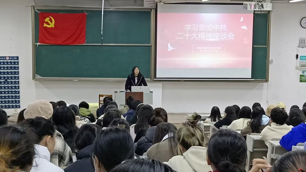 本次座谈会围绕党的二十大精神及新党章的学习开展,本科生党支部书记武莉华向积极分子开展学习宣讲,共同学习党的二十大精神和新党章,并向积极分子提出成为有理想、敢担当、能吃苦、肯奋斗的新时代好青年的殷切期望。通过观看学习习近平在党的二十大上的发言,入党积极分子们全面准确的学习了党的二十大精神,明确自身的入党目的与意向,深刻领会到党领导下的新时代的工作历程与伟大变革,认识新时代下青年的责任与担当、义务与使命。