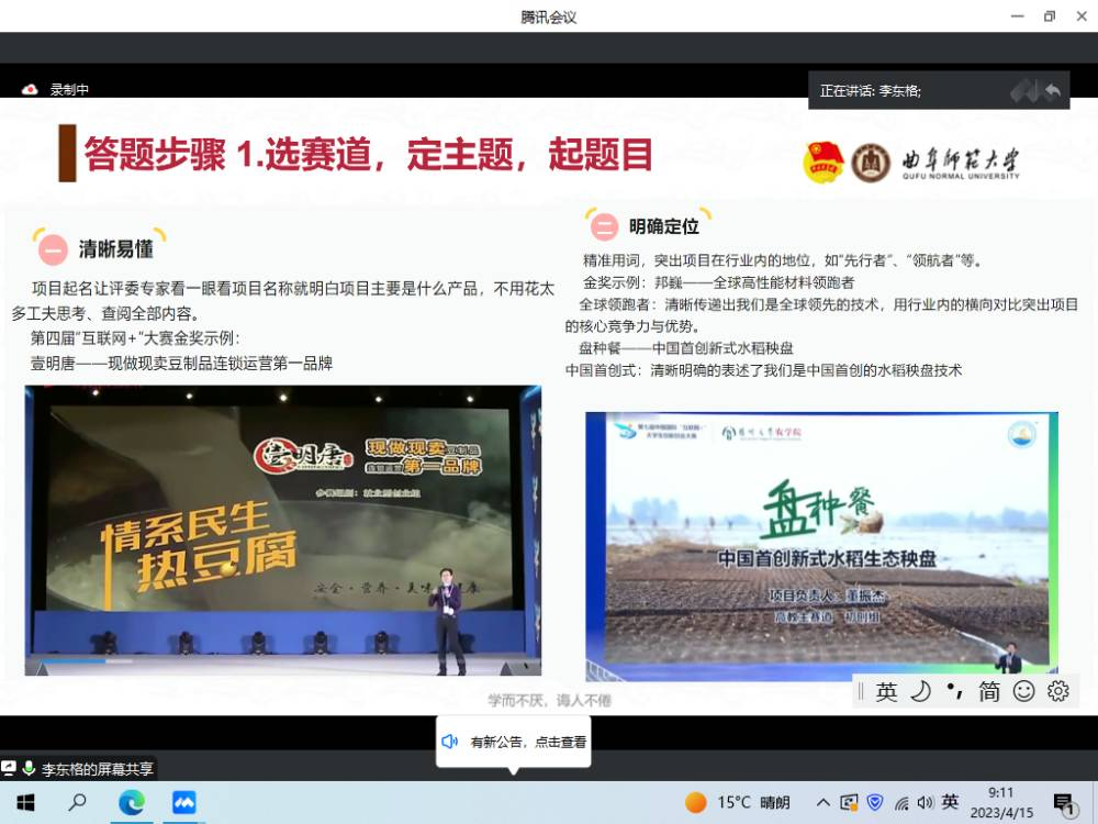 李东格根据自身参赛经验,从赛道类型解读、备赛方向方法、创新项目突破等方面展开详细介绍。在赛道类型过程中,要选择一个符合社会发展热点同时与自己专业相契合的赛道,同时结合团队特色拓宽比赛思路;在备赛方向上,要注意选题的可实现性格吸引力,梳理明确项目的核心内容以及创新点;创新项目突破上,她建议同学们通过深挖比赛材料、阅读高质量文献的方式把握比赛方向,同时要注意在生活多观察、多思考,勇于尝试、敢于创新。