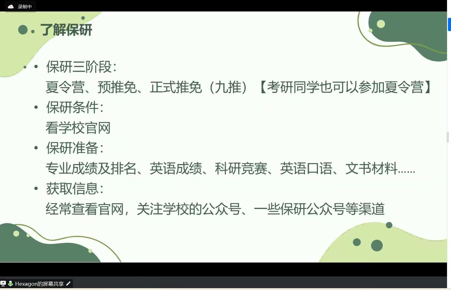 分享会上,三人从择校、日常学习、复试和面试等方面进行讲解。王盈盈重点讲解了面试需要注意的问题,准备简历、证书扫描成电子版,练习口语能力,准备专业问答等。王佳宁分享了自己的保研经验,讲解了保研三阶段,并鼓励大家抓住更多机会,发挥自己的优势跨专业尝试,不要给自己设限。张乐康提出应参考多方面意见,综合自身情况做出判断,选出自己理想的目标院校,准备好自己备考过程中需要的资料。最后,主讲人们与同学们进行了交流解答,更进一步解决了同学们的问题,增强了学生们的信心。