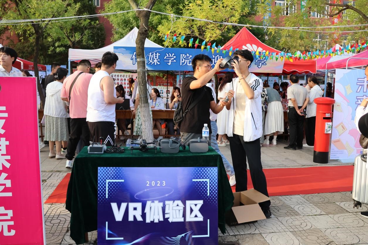 此外,报到处还设有VR体验区。新生们在志愿者的帮助下戴上特制VR眼镜,以独特的方式体验曲园风采,感受传媒“科技力”;展示区的无人机设备引起新生们的阵阵惊叹,先进的拍摄设备、精美的传媒作品令新生们对未来的大学追梦之旅充满期待。