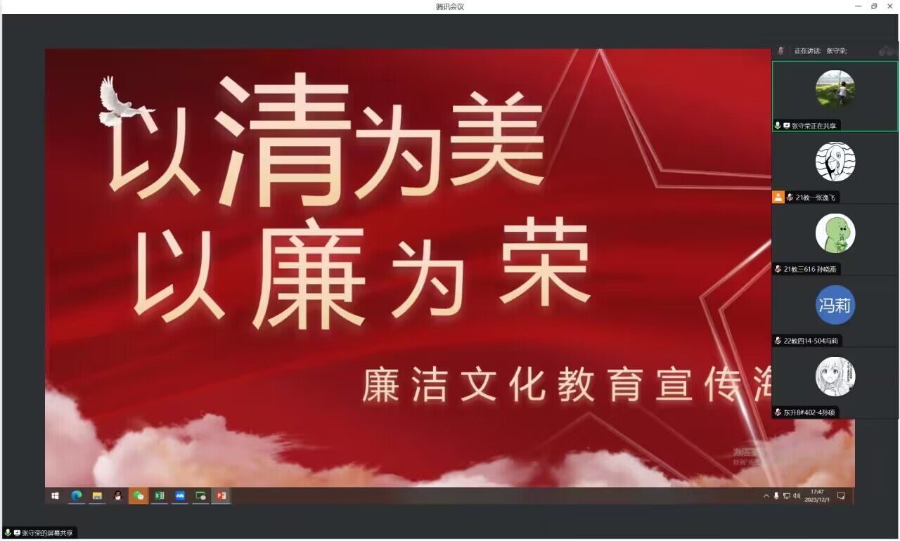 主题班会综合采取视频观看、案例学习、主题讲解等多种方式进行,组织同学们观看视频《清廉中国——初心日记》。视频以时间顺序讲述一个年轻人从“廉”到“贪”的毁灭之路,警醒观众要时刻擦亮初心,坚持廉洁自律,杜绝贪污受贿,对自己的行为负责。观看视频后,学生们纷纷表示受益匪浅,认为应自觉抵制不良诱惑,强化廉洁意识,自觉做到不忘初心、牢记使命,践行清廉精神,做清正守廉大学生。