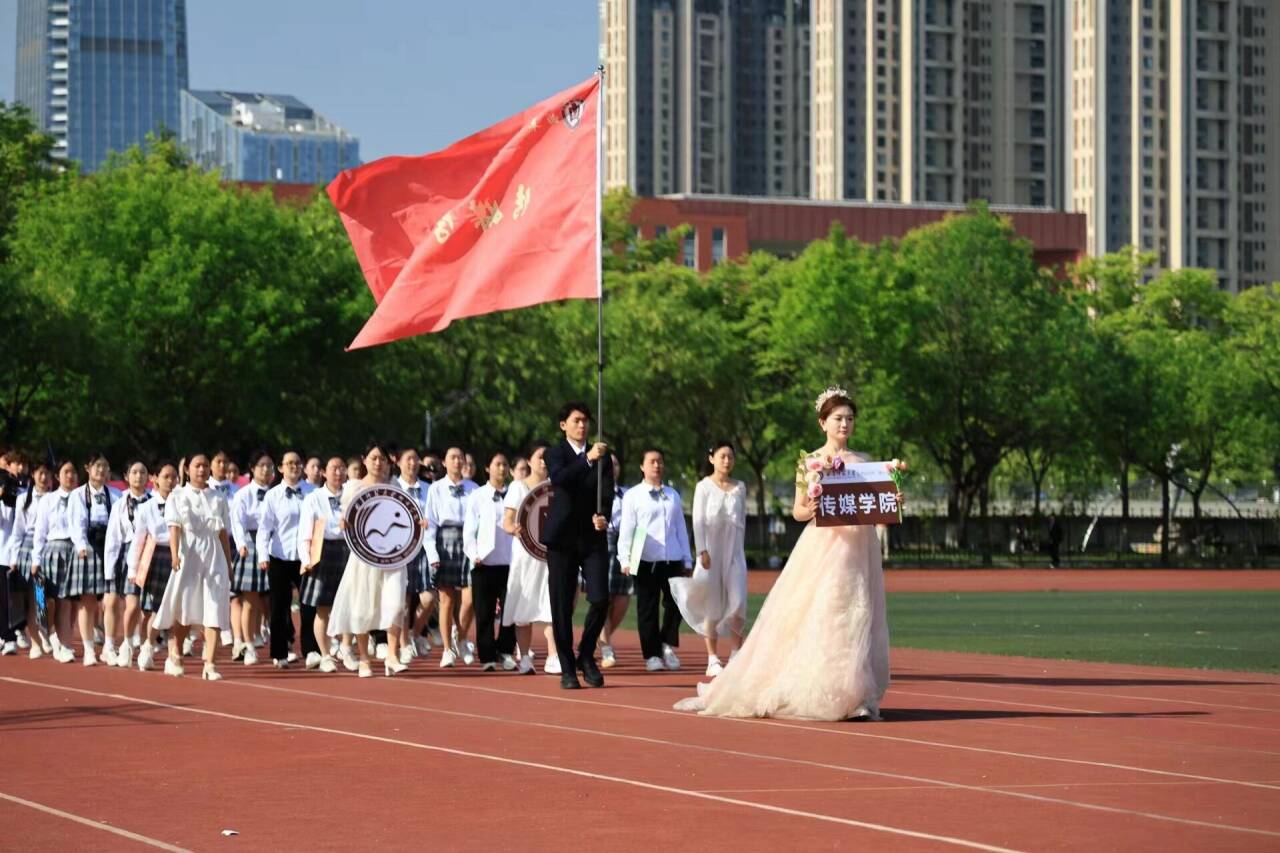 方阵在领队的带领下,迈着整齐的步伐,手里挥动着白色气球,响亮的喊着“青春传媒,扬帆起航,劈波斩浪,共创辉煌”的口号,缓缓走过主席台,脸上洋溢着青春的笑容,展现出传媒学子朝气蓬勃的活力和风采。