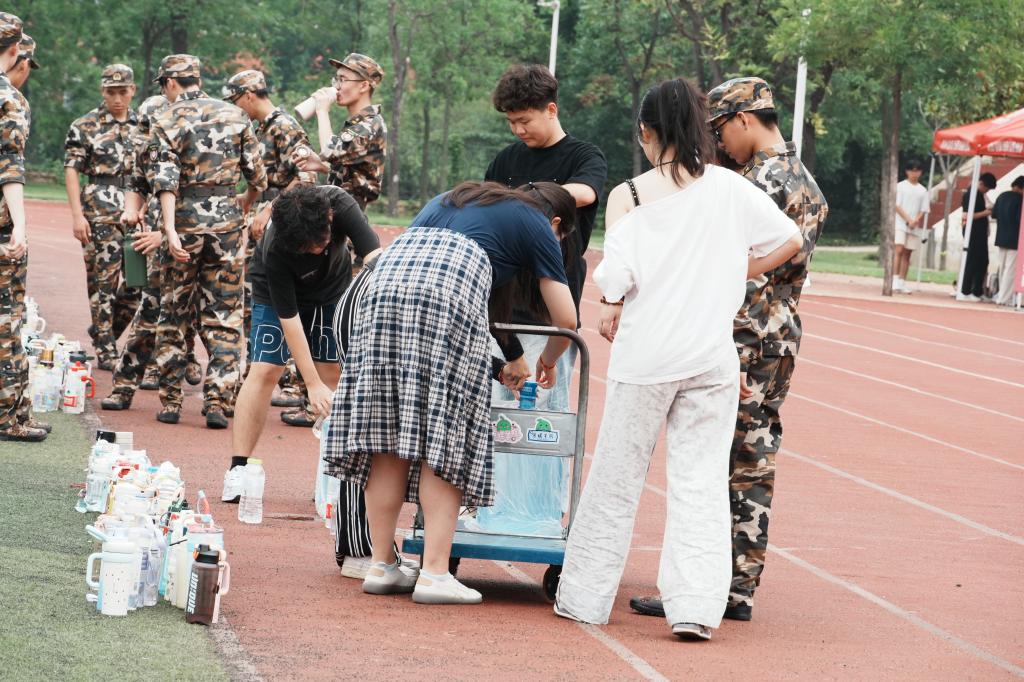 训练场上,迷彩服构成了校园里最亮丽的风景线。新生们身姿挺拔、目光坚定,在教官的带领下投入到紧张的训练中。从站军姿时的纹丝不动,到稍息、立正时的精准转换,再到齐步走时的步伐一致,每一个细节都凝聚着新生的努力与教官的悉心指导。训练中途突降阵雨,新生们迅速整队、听从指挥,短暂调整后便重拾状态投入训练,展现出良好的纪律意识。与此同时,学院后勤保障小组全程值守,备好饮用水、急救药品等物资,为军训顺利开展保驾护航。