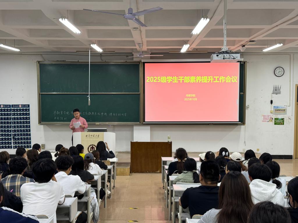 在JA205组织召开2025级学生干部素养提升工作会议。会议由2025级辅导员张洪孟主持,2025级班团委学生干部参加。