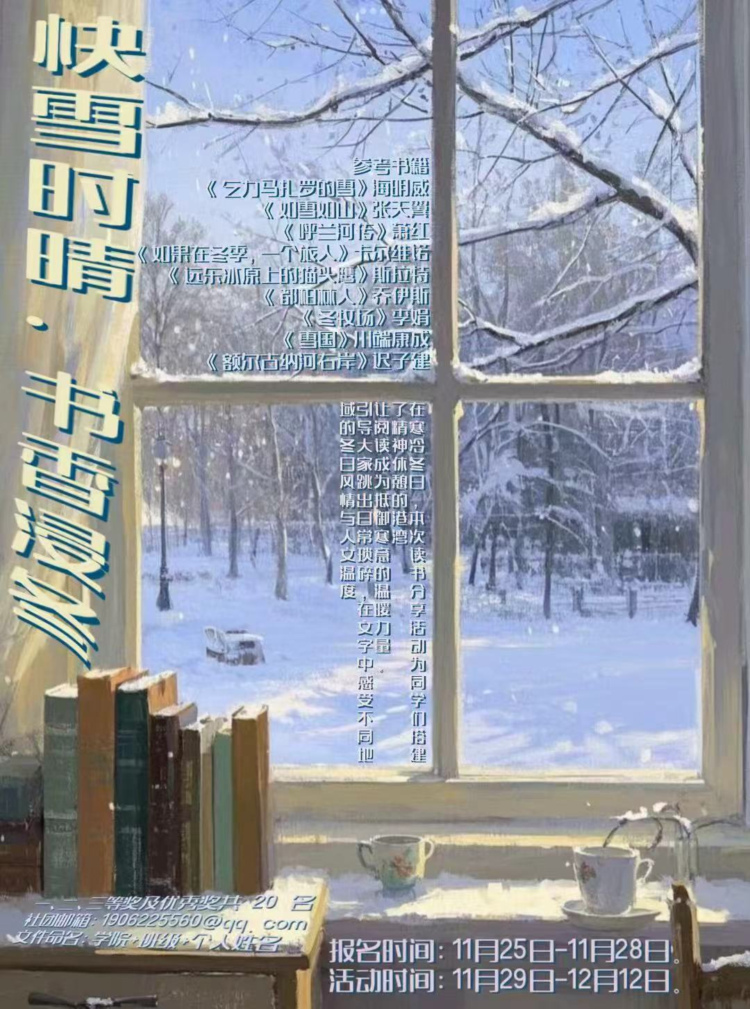 为搭建深度阅读与心灵交流的平台,引领同学们体悟冬日中蕴藏的生命力量,读书社于11月29日至12月12日面向全校学生开展了“快雪时晴,书香浸冬”主题读写活动。