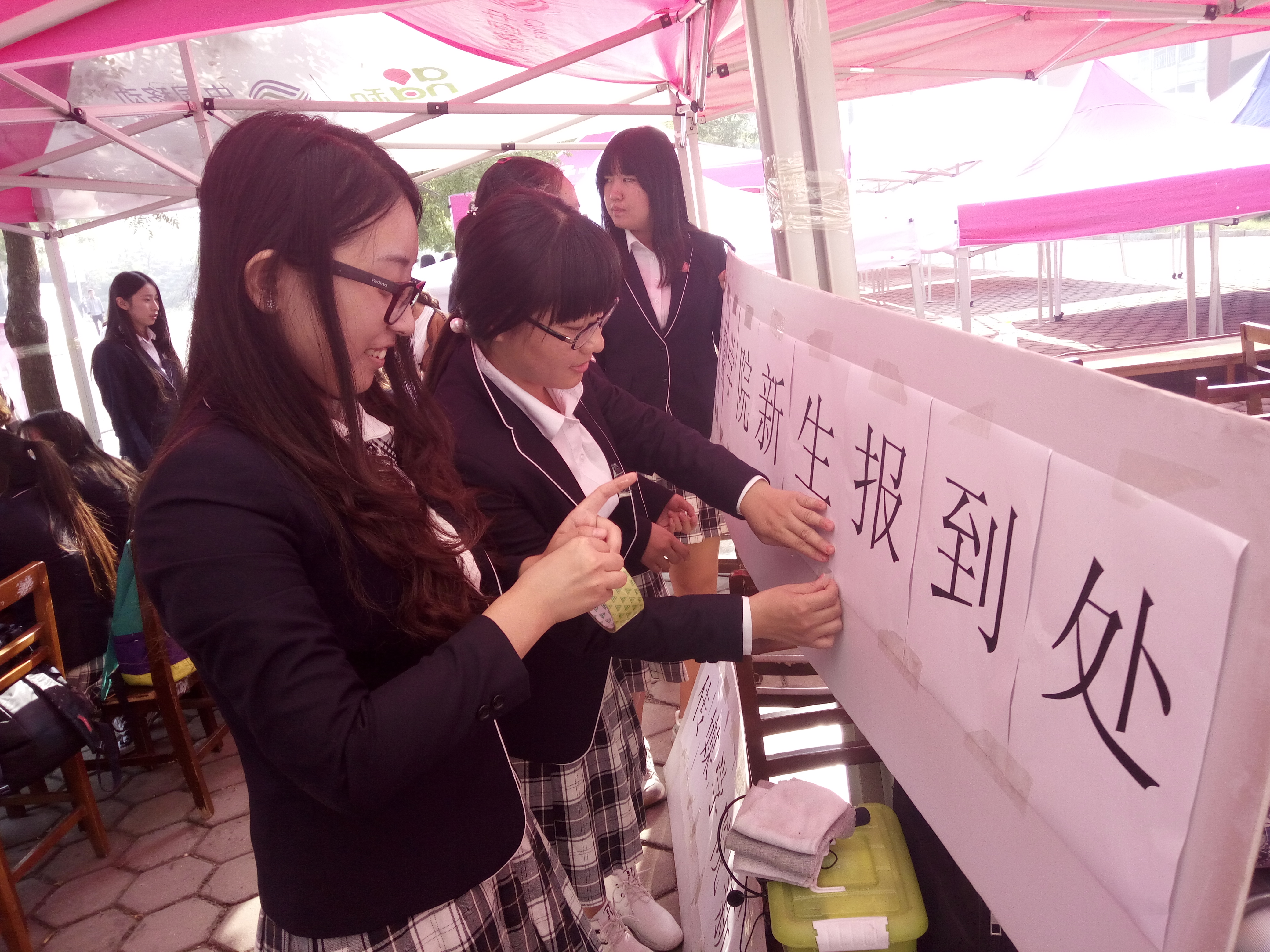 团委学生会无课人员,到大本营处开始准备桌椅、摆放发放的宣传礼品、张贴展板、准备热水。直到7:00,所有的筹备工作准备完毕,礼仪引导小组人员站立在大本营处,准备迎接新生到来。
