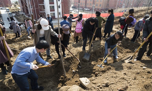 上午9:40,老师和同学们到达植树地点开始领取工具。随后,在工作人员的指导下,老师和同学们分工协作,热火朝天地开始了植树活动。挖坑、扶树、填土,老师和同学们都忙得不亦乐乎。经过一个上午的辛勤劳动之后,小山坡上立起了数百棵树苗,呈现出一派盎然生机,迎接这春天的新气象。