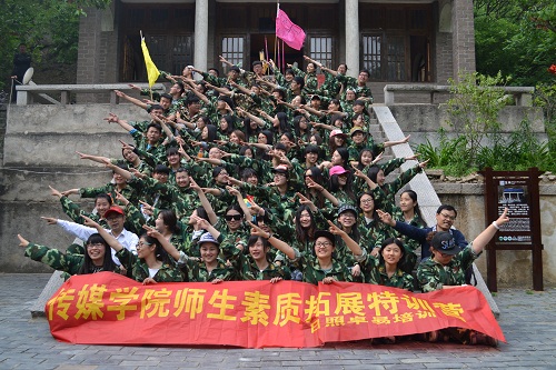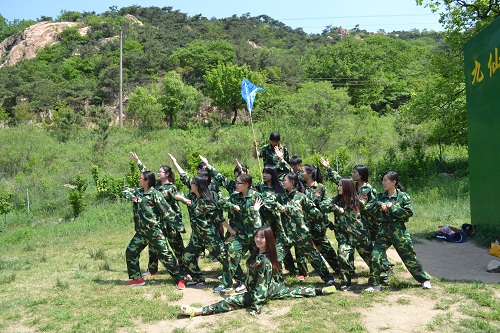 师生一行从学校北门出发,前往本次拓展培训的目的地九仙山。肖龙航在车上特别强调了本次活动的相关安全事项,希望同学们在享受户外乐趣的同时保证自身安全。到达培训场地并进行简单培训后,教练将同学们分成四队并分发队旗,“超能陆战队”“水手队”“向前队”“无敌队”,四队同学很快起好队名,并在旗子上画出队旗的标志。“水手队”在队旗上画了一艘航行的帆船,并在帆船顶部画上一面迎风飘扬的旗帜,他们选择用《水手》作为队歌,齐声高唱“他说风雨中这点痛算什么,擦干泪不要怕,至少我们还有梦。”“超能陆战队”在旗子上画的卡通形象“大白”同样惟妙惟肖,演唱完队歌后,他们摆出的团队造型引来其他团队的热烈掌声,并在本环节率先拿下第一名。