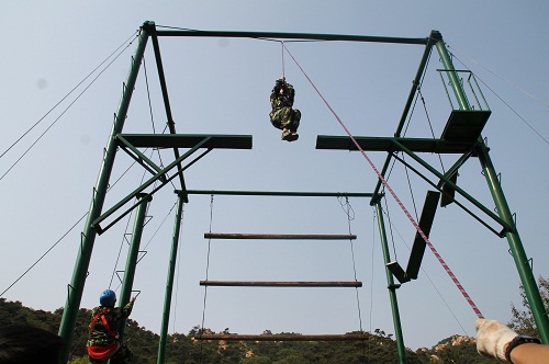 随后进行的穿越电网和高空断桥等环节,分别在团队合作和挑战自身方面予以培训。为了让团队里的所有人安全穿过电网,并合理分配每个电网的使用次数,队员们一起“头脑风暴”,手脚并用将伙伴儿“运”到安全领域,困难在大家的合作下迎刃而解。而为了不“拖后腿”,每位队员都高度紧张,争取让团队一次通过。高空“断桥”和“空单”环节让所有队员都捏了一把汗,因为这个项目完全是“自我发挥”,在教练的鼓励下,所有队员克服恐惧,大喊“我坚强,我自信,我一定能行!”的口号后勇敢地爬上了八米高台。