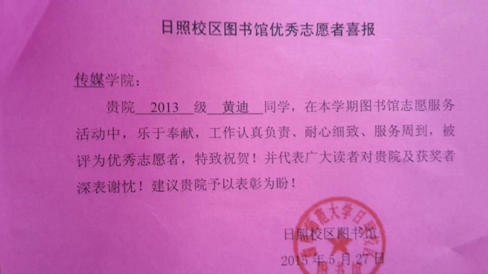 2015年5月27日,我校图书馆开展了图书馆优秀志愿者评比活动,我院3名同学得到认可并获得“优秀志愿者”荣誉称号。