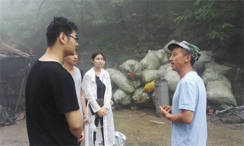 在盘山公路一侧的偏远地带,团队成员找到了挑夫队休息处的负责人和一位三十余年工龄的挑山工。在说明了来意后,团队成员与两位师傅交流了一个多小时。师傅介绍了他们的工作现状与生活条件,挑夫们一直呆在略显简陋的休息处不下山,现如今只有十几个人挑山工,所有货物都归他们运,虽然近年开通了运货索道,可索道不是随处可至,总有人力运输的需求。