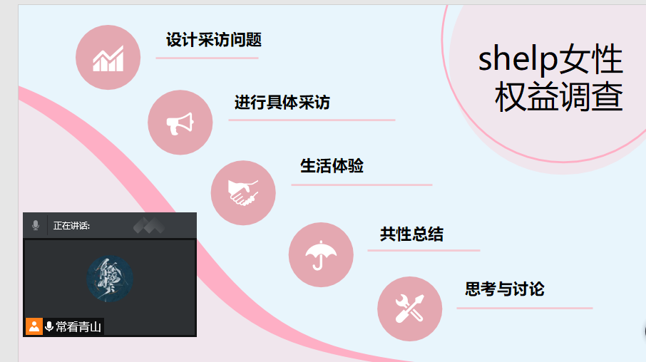 会议过程中,她指出采访话题要围绕女性的安全健康、就业、情感等展开。shelp项目的意义就在于使女性同胞意识到,女性互助可以增加其信心,为其梦想助力。会议末尾,根据小组成员不同实际情况和能力,队长进行分工,便于队员之间能力上的取长补短,提高工作效率。本次会议的顺利召开不仅增强成员之间的默契,加深各成员对实践活动的深刻认识,更对提高工作效率、推动实践工作的顺利展开具有积极意义。