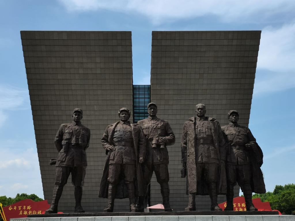 下午三时许,成员们到达渡江战役纪念馆,全馆自南向北由五角星胜利塔、总前委群像和纪念馆组成。馆外,最显著的标志便是渡江战役总前委群雕,从左往右分别是粟裕、邓小平、刘伯承、陈毅和谭震林五位总前委成员。纪念馆入口处也为庆祝中国共产党成立100周年而摆放了“奋斗百年路 启航新征程”的红旗标志物。馆内的陈列以渡江战役的进程为主线,贯穿战前国内外形势、战役的决策部署、战役经过、历史意义等各个方面,借助一系列的图片和文字以及现代化的传播手段全面生动地向参观者展示渡江战役的全过程。进入馆内,成员们首先看到的就是大厅中央战役场景的雕塑及其中间的入党誓词,不少前来参观的共产党员在此握拳起誓表达决心。往里走,映入眼帘的便是一幅名为“送子参军”的图画,其中描绘了老人小孩锣鼓喧天,欢送人民子弟光荣参军的场景,从中成员们体会到华夏儿女参军报国的坚定和勇敢以及对全国解放的渴望。再往里走,关于“巢湖练兵”的雕塑吸引了成员们的目光,其详细展示了战前中国人民解放军为顺利渡过长江而勤奋练兵、提前适应艰苦环境的画面。继续前进,成员们注意到纪念馆的墙壁上陈列了众多渡江战役人民解放军兵团以上领导人和中共中央及渡江前线领导人的画像,领导人们均身着军装,佩戴军帽,面带祥和,眼神中却透露着坚定和刚毅,画像下摆放的是许许多多英勇牺牲的先辈们生前的遗物,他们的战地漫画、他们的荣誉勋章、他们所使用过的生活物品等。走过这面领导人的光荣墙,成员们来到的是一条“U”字形的长廊,长廊中央摆放着一艘扬帆的木船,船只规模不大,陈设也十分简陋,由此可以看出当时战役装备的低下,更显中国人民解放军的勇敢无畏,长廊两侧以图片文字、实物展示和视频播放的方式,向人们展示了渡江战役后期从突破江防到欢庆胜利的全过程,形象立体地再现了“打过长江去,解放全中国”的恢宏篇章。参观末尾,两位成员走进烈士名录墙,心怀敬畏之情,在庄严肃穆的环境之下缅怀革命先烈丰功伟绩。