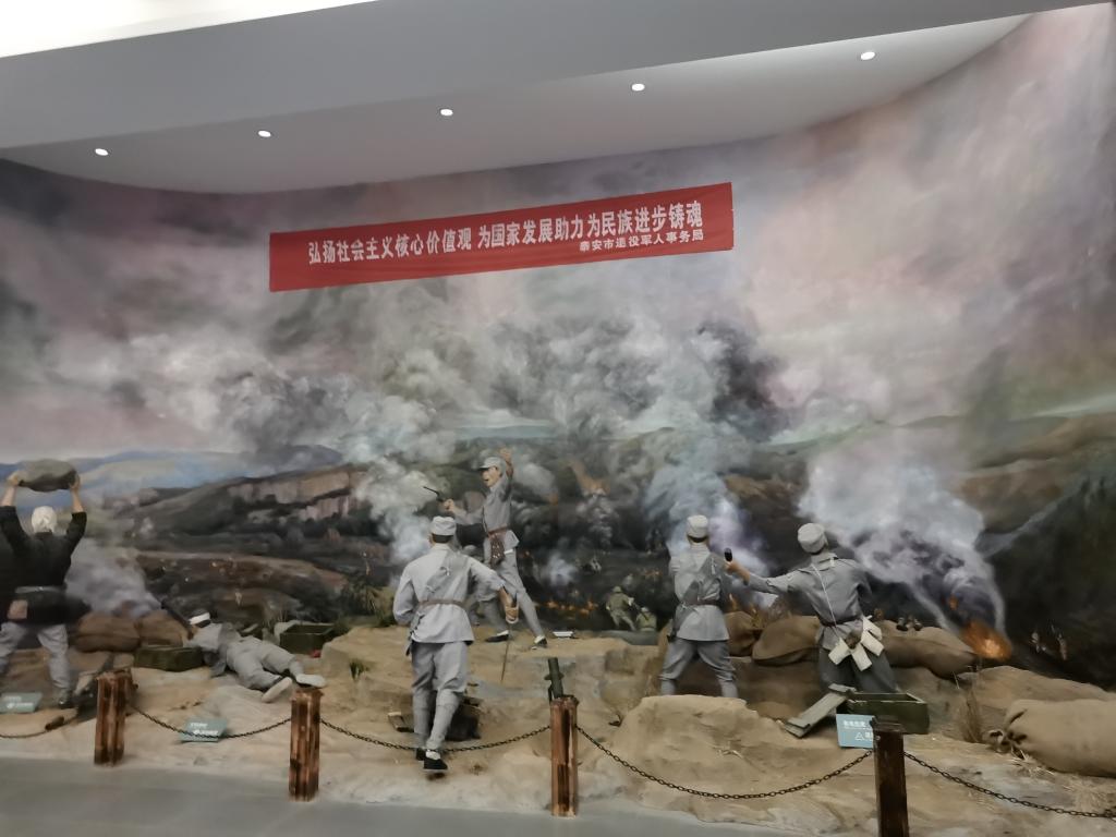 在通过体温测试以及健康码出示后,实践队员进入展览馆中进行参观。展馆中摆放着的是一个又一个当年使用过的战斗器械,满是铁锈,显示着先辈们在刀与枪的斗争下不怕流血牺牲的精神。展馆的墙壁上,贴着各个在泰安发生的战役的信息,泰安县、宁阳县、肥城县等各县的战役在当时那个年代都异常激烈。展馆的最后立着一面革命烈士英名录,上面写着“烈士永垂不朽”,一个个平凡的名字的背后,是不朽的灵魂,是值得被后人永远纪念与尊敬的英灵。
