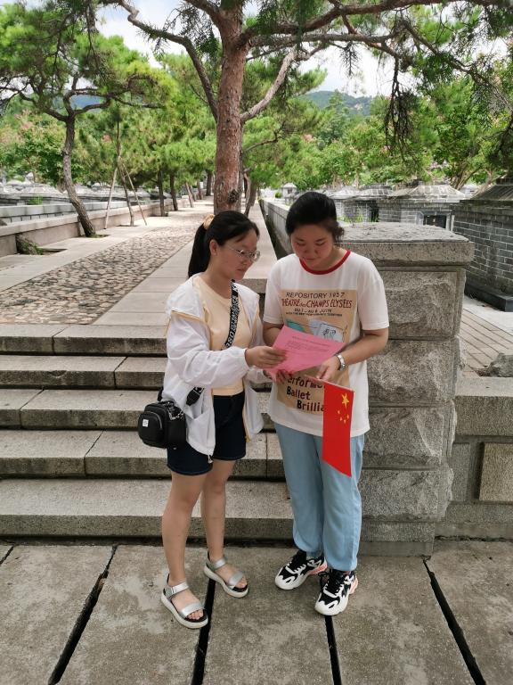 之后实践队员进行烈士陵园以及展馆参观。进入烈士陵园后,首先映入眼帘的就是革命英雄纪念碑,高大耸立的碑体,碑石下面篆刻的一个个革命先烈奋勇拼搏的身影,无不在显示着当年革命的壮烈,先辈们牺牲时的毫无畏惧的精神,以及百姓们对革命的支持。在纪念碑的后面,是一位位革命烈士的墓碑,在这里长眠的各位烈士他们并不孤独,与队员预想中的荒凉孤寂不同,烈士陵园到处是青葱的绿叶,夏意盎然,生机勃勃。陪伴他们的不仅是一处处绿植,还有在此一年又一年守护着他们的附近老人。