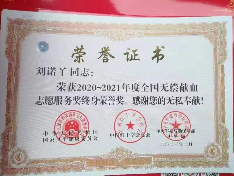 2020级教育技术学二班的刘诺丫同学荣获“全国无偿献血志愿服务终身荣誉奖”。