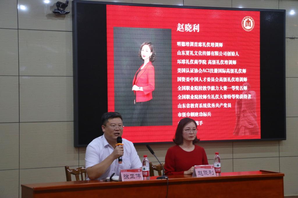 于图书馆报告厅开展了“知行善语 与礼相约”大学生礼仪专题培训会,此次讲座有幸邀请到了明德培训首席培训师赵晓利老师。传媒党委副书记徐正伟、19级辅导员乔希出席本次活动。2019级全体新生参加本次培训会。本次礼仪培训会由徐正伟主持。