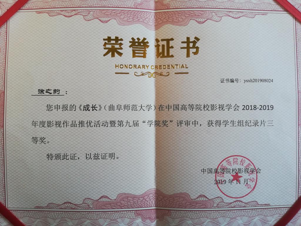 2016级新闻学专业学生徐之的及其团队创作的纪录片《成长》荣获“学院奖”学生组三等奖。