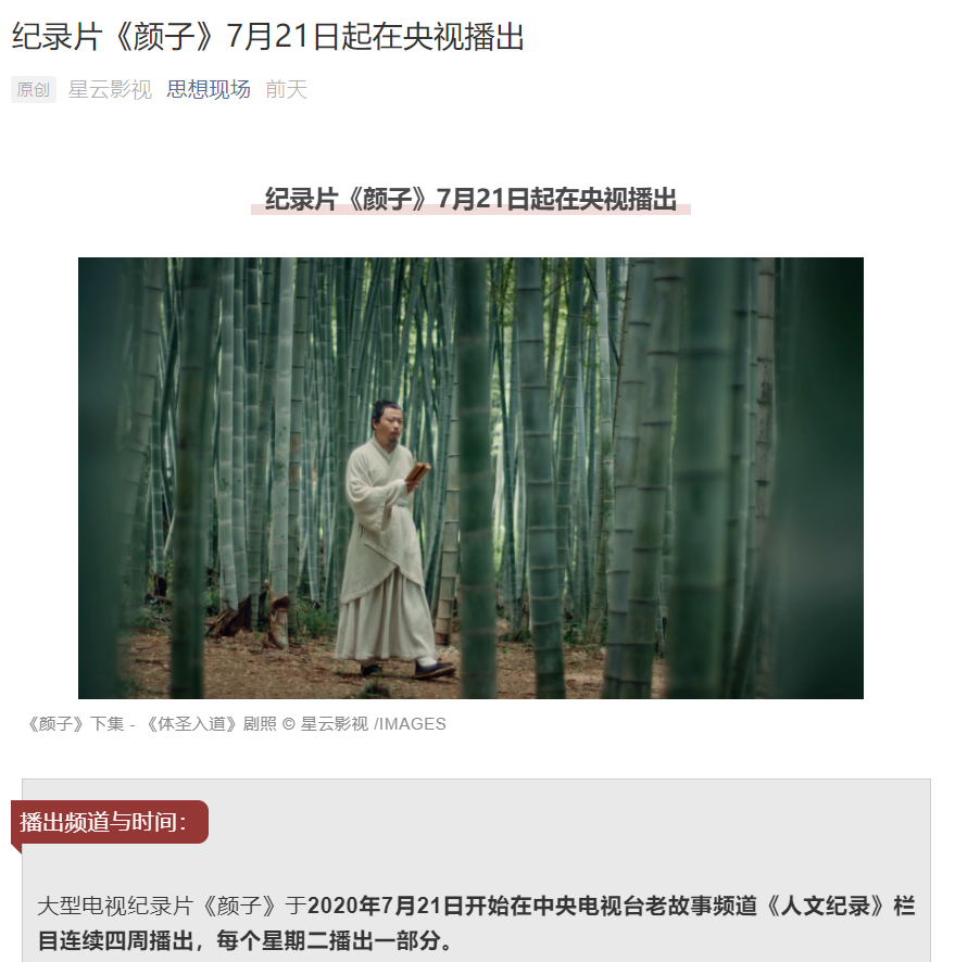 7月21日起,大型电视纪录片《颜子》将于每周二的11:30、19:30在中央电视台老故事频道《人文纪录》栏目连续四周播出。此节目由知名儒学专家、曲阜师范大学足球在线直播
