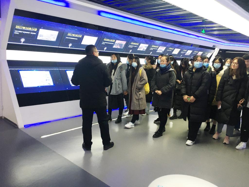 见习同学首先参观了济南新视觉数码科技有限公司,在新视觉数码实训基地聆听了影视制作专业团队负责人的报告会。同学们在学习Pr、AE等专业课程基础上,通过报告会对校内课程所学之实景应用有了更直接、深刻的认识。随后对“创新谷”的参观过程中,同学们见识到高校科研与企业合作的创新成果。他们走进VR虚拟现实体验馆,体验了瀑布水流数字签名墙,跟随“创新谷”新锐企业贝壳视频公司负责人学习到新媒体直播电商运营实况。最后,同学们来到贝壳视频线下基地“六号港口”进行了实地考察学习。