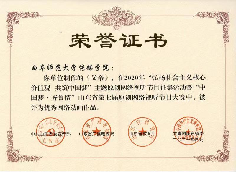 近日,2020年“弘扬社会主义核心价值观共筑中国梦"主题原创网络视听节目征集活动暨“中国梦·齐鲁情”山东省第七届原创网络视听节目大赛落下帷幕。曲师大委员会宣传部获得“优秀组织奖”,我院编辑制作的动画作品《父亲》被评为“优秀网络动画作品”。