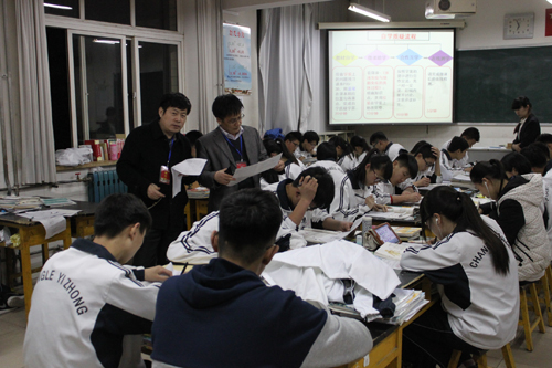 25日上午8:00,我院师生继续观摩翻转课堂的第二阶段——训练展示课。在展示课上,任课教师首先将昨天晚上收集起来的疑点、难点问题放在大屏幕上,逐个分析。分析之后抽取每组同学去黑板上展示自己的作业,因为有了昨天自主学习的基础,整个课程的进行十分顺利。以学生为中心,学生自主学习、合作学习的良好课堂氛围给我院师生留下了深刻印象。
