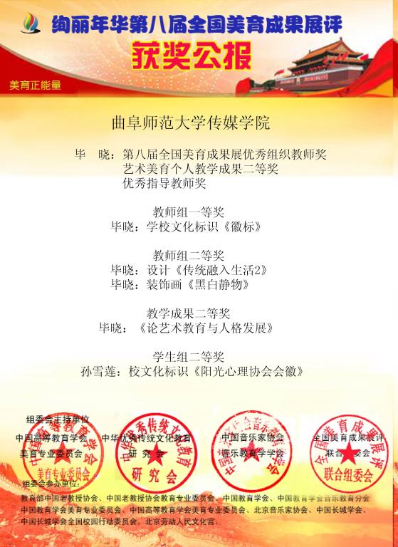 在本届成果展评中,毕晓老师荣获“第八届全国美育成果展优秀组织教师奖”、“艺术美育个人教学成果二等奖”、“优秀指导教师奖”等多项荣誉称号。毕晓老师的学校文化标识作品《徽标》荣获教师组一等奖,设计作品《传统融入生活2》、装饰画作品《黑白景物》获得教师组二等奖,论文《论艺术教育与人格发展》获得教学成果二等奖。孙雪莲同学的校文化标识作品《阳光心理协会会徽》荣获学生组二等奖。