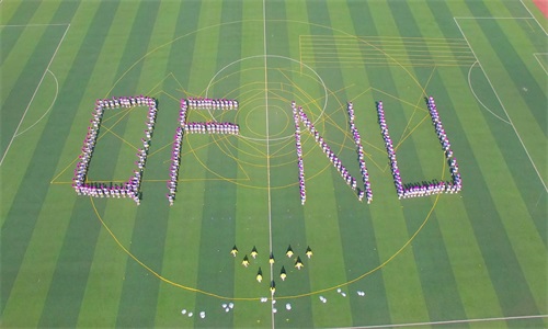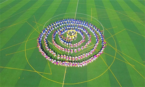 团体操队以“贪吃蛇”的形态进场,创意十足,让人眼前一亮。活力四射的舞步洋溢着青春的气息,富有内涵的队形伴随音乐节奏不断变化,从最初的两个三角形变成六芒星形。六芒星寓意着曲园学子不孜不倦、勤勉躬行的宝贵品质,彰显出曲园海韵、杏坛儒风的独特魅力。接着,队形变成了12条直线并开始跑圈,年轻的学子层层叠叠,最终围成了三层圆圈,组成太阳的形象,寓意“渊源共生,和谐共融”。随后团体操队排成的“Q、F、S、F”四个字母与“1955、2018”两组数字,代表“曲阜师范大学”从1955年到2018年63载的变迁。63年铸就了曲园学子德性、睿性、韧性的品质,也沉淀了足球在线直播