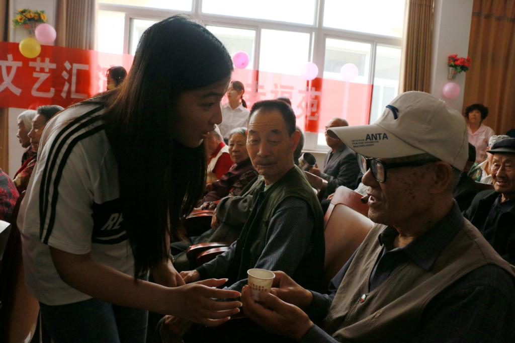 文艺汇演开始之前,爱心社社长李雪珍就本次活动做了描述,并预祝本次活动圆满成功。一首《被风吹过的夏天》拉开了本次活动的帷幕。紧接着,魔术表演更是深深的吸引了老人们的眼球。接下来的朗诵《风华录》、歌曲《万泉河水清又清》、《看月亮爬上来》,使老人们赞不绝口,掌声连连。《梅花桩武术表演》让老人们看到了青年人的阳刚之气。古筝表演《梁祝》、京剧表演《梨花颂》更是让老人们沉浸其中,自己也跟着唱起来。话剧《精忠旗》将汇演的的气氛推向了高潮,当看到岳飞背后被刺“精忠报国”四字时,老人们脸上都露出了会心的微笑,想必是对青年人饱含期待。随后,志愿者们送上了精心装框的“最美老人照”和一些其它小礼物,老人们脸上都洋溢着快乐的笑容。