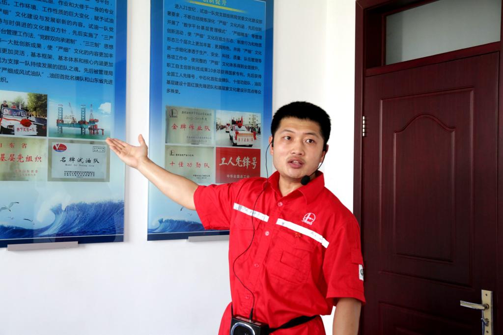 海洋试油作业大队试油一队刘队长及讲解员卢涛早已等候在大队门前。据了解,试油一队成立于1984年,30多年的发展已经形成了试油一队专属的“以责任为纽带,以延续为轴心”的“沿袭文化”——除海上施工作业人员,其他职工每周一均回队进行技能培训;各队负责人传达上一周的公司精神,同时,全体干大扫除,培养团队合作精神。这充分体现出习近平总书记提出的“文化自信”。二人以“严明管理、严期检查、严格训练”的工作作风,和“家庭式教育、军队式管理”的管理理念为核心,从职工宿舍军事化管理、消夏晚会等文化活动、技术创新等方面进行介绍。