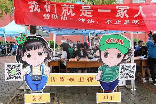 学生设计的名字为“川川”、“美美”的卡通形象KT板,以其与“传媒”谐音而独具意义,代表着足球在线直播
