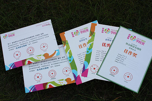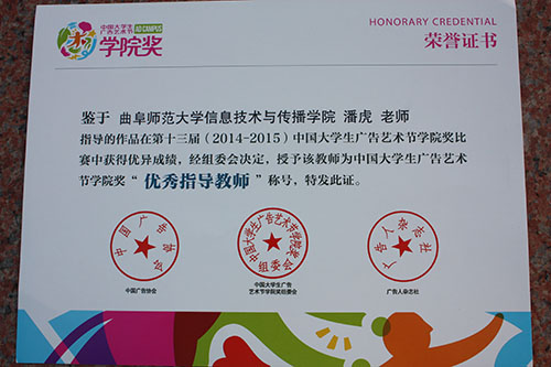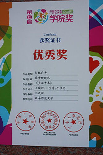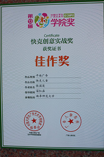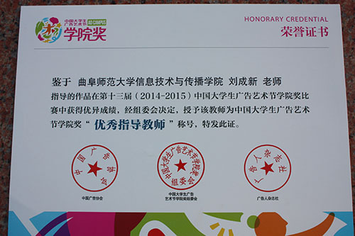 师生在比赛中发挥了大学生的创新精神和实践能力,积极动手、团结协作创作出优秀的设计作品,其中由潘虎老师指导,颜雅伦、张学清、黄春雪同学创作的广告文案类作品《自由拼接,舒而不漏》荣获佳作奖,由苗红磊老师指导张国英同学创作的平面广告类作品《快克儿童》荣获佳作奖;由刘成新老师指导的王晓婷、王宝秀、牛佳雯一组同学的影视广告类作品《多样青春》获得优秀奖;潘虎、刘成新老师获得“优秀指导教师”荣誉称号。