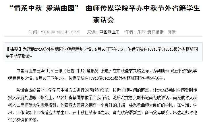 【来源:中国网报道:曲师足球在线直播 举办中秋节外省籍学生茶话会 | 发布日期:2015-10-06 】
