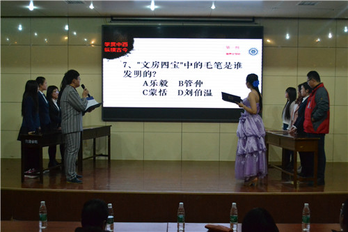 一段优美的古典舞和劲爆的街舞斗舞正式拉开了第四届文化知识竞赛决赛的帷幕。顺利晋级初复赛的各院系优胜者组成了六支队伍进行最终的决赛比拼,本次决赛共分为三轮:必答题,冒险题和抢答题。第一轮必答题中,参赛各队通过抽签的方式决定出PK火力队和传媒无敌队,答题全队和Beyond the dream,逆袭队和four mix互为对手进行比赛。对阵的两组队伍为对方选题,答对题目多者取胜,优胜队晋级下一轮。经过激烈的比拼,PK火力队、Beyond the dream和逆袭队顺利晋级第二轮。