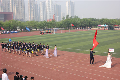 高喊“传媒传媒,舍我弃谁,看我传媒,耀我雄威”的口号整齐的走上跑道,方队中每位同学手持向日葵,代表着传媒学子朝气蓬勃的精神面貌和激情四射的活力青春。方队入场后,荆兆勋致为运动会致开幕词,他表示:“体育运动是教育事业的一项重要组成部分,是大学生健康成长、全面发展的基础性工程。”开办运动会有利于激发学生对于体育的兴趣,并在全校形成一股“热爱体育、崇尚运动、关注健康”的良好风气,同时他也代表学校党委预祝运动员们都能取得理想成绩。在运动员代表和裁判员代表相继完成宣誓后,运动会开幕式正式开始。