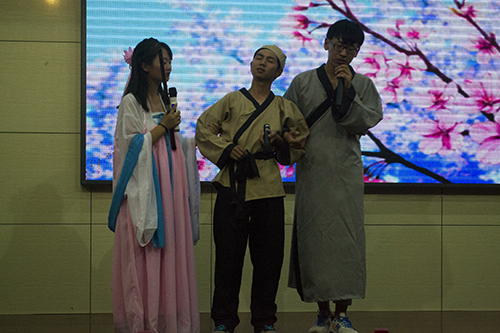 向黄海影剧社颁发社团活动资金600元,并鼓励社团加强活动举办力度,在提高同学们参加活动积极性的同时发展好社团。随后,比赛在唯美清新的开场舞《尤物》中缓缓拉开了帷幕。本次才艺比赛以守、攻擂方式进行节目对决,分为歌曲PK、相声PK、话剧PK三个环节,每一个环节结束后都由评委老师和现场观众对节目进行投票作为最终节目排名的依据。歌曲对决赛中,王心融、郭梦琪用优美的声音为大家带来歌曲《倒带》,张宇不甘示弱,一首《梦醒时分》振奋人心。在歌曲大比拼游戏环节中,主持人邀请七位参赛选手和一位观众上台并分为两队,每位参与者依次唱出含有“爱”字的歌,场上氛围轻松活泼。相声对决环节中,王振、刘聪用妙语连珠的台词、搞笑夸张的动作演绎相声《满腹经纶》,笑点连连,观众席中呼声阵阵,掌声雷动。而官小迪、孔琛刚柔并济、风格混搭的舞蹈串场更是引起观众们的连声叫好。比赛的重头戏是新闻班同学带来的话剧《暗恋桃花源》和《倾城之恋》,同学们大饱眼福。在经过三轮才艺PK环节后,王心融、郭梦琪的歌曲《倒带》,张宇的《梦想时分》名列歌曲节目的前茅,刘聪、王振的相声《满腹经纶》在相声PK中脱颖而出,《倾城之恋》依其独特的剧情和引人入胜的表演氛围荣获话剧组的桂冠。