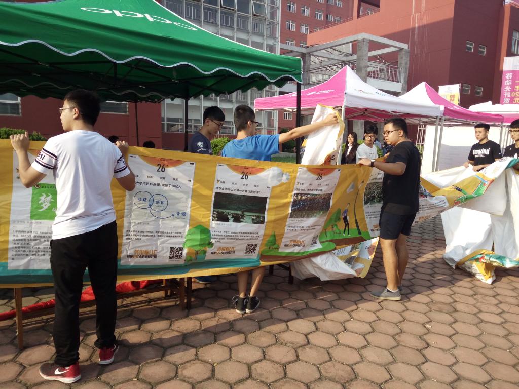 团委学生会无课人员,到大本营处开始准备桌椅、摆放发放的宣传礼品、张贴展板、准备热水。直到7:00,所有的筹备工作准备完毕,礼仪引导小组人员站立在大本营处,准备迎接新生到来。