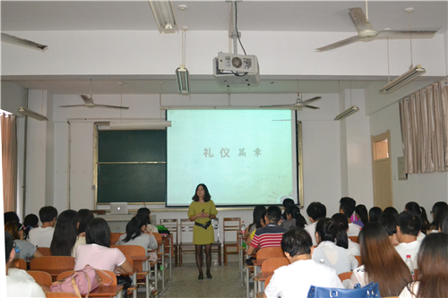 首先,宋清岩具体讲解了包括站姿、坐姿等行为礼仪,名片礼仪,商务礼仪距离,楼梯礼仪,引领礼仪,办公室礼仪等在内的礼仪课程。宋清岩针对不同姿态,分别请学生到讲台示范,然后为大家纠正错误,具体阐释。宋讲师端庄优雅的姿态赢得了同学们的阵阵掌声。宋清岩表示,礼仪表现出一个人的修养,对发展人际关系具有重要意义。随后,她提出形象概念,并从科学角度解释了形象的重要性,即形象决定别人对你的态度、行为,体现出人的品格修养。为此,宋清岩具体讲解了注意个人五官基调与服装搭配技巧、五官量感与服饰搭配技术以及五官量感的表现形式等等。在讲解中,宋清岩以鲜明的图片对比和具体人物实例,生动地诠释了形象对个人发展的重要性。在最后的化妆篇章中,宋清岩选出一名女学生,并现场为大家进行化妆技巧演示,为在座学生介绍职场妆容。