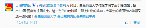 学生手持国旗,拼成“中国”图案,为祖国庆生。选择这样的方式拍照,他们实属第一个,合影随即被日照共青团转发。足球在线直播