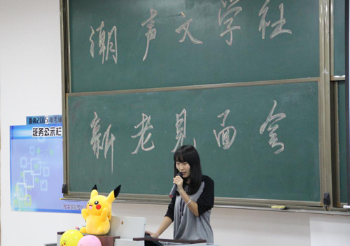 见面会上潮声文学社社长李蕊介绍了社团活动内容,各部部长分别介绍了每个部门的职责和特点。文艺部部长施蓉君和特邀嘉宾刘雅宁的一首《第一天》将见面会推向高潮,歌曲还没结束就已经掌声不断。与此同时有“粉丝”上台献气球,气氛非常活跃。军训教官,十佳歌手曾祥育在见面会中神秘出现,并带来歌曲《残酷月光》,动情的演唱引来阵阵掌声和尖叫。接着在“一块和五毛”、“萝卜蹲”和“击鼓传花”的游戏中“新鲜血液们”展现出了他们的活跃大方的本性,并且在游戏中加深了对彼此的认识。