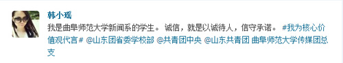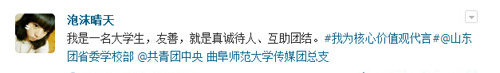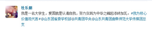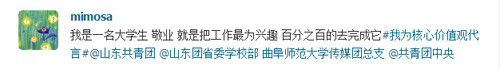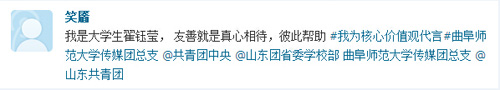 发起#我为社会主义核心价值体系代言#话题,参与人需要发送腾讯微博“价值观体”并@曲阜师范大学传媒团总支 @曲阜师范大学团委等。众多传媒学子积极参与进来,编写“价值观体”微博参与互动,新媒体应用与管理部随即转发。“我是一名大学生,爱国就是认清自我,努力实践为中华崛起添砖加瓦。”“我是曲阜师范大学新闻系的学生。诚信就是以诚待人,信守承诺。”同学们用朴实的话语表达了自己的感情,并用实际行动践行社会主义核心价值观。