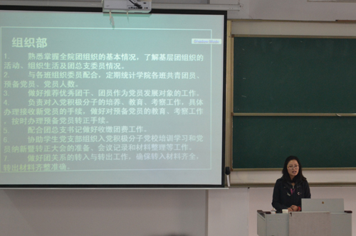 为加强我院学生干部的工作能力,纠正他们的的工作思路和方法,以促进学院工作更顺利地开展运行,11月9日上午8:00,干部培训班第三讲在A101教室开讲。本次讲座邀请了2014级助理辅导员,曾任2010级团总支副书记的张亚楠为主讲人,向14级学生干部讲述团总支的职能与运转。 2014级全体班团委以及学生会成员参加了此次培训。