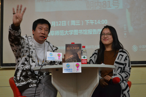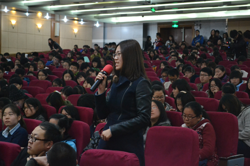 讲座进行到最后一个互动环节,即问即答,由在场学生提问,于老师在场解答。当一名学生问道,《京城81号》如同很多电影一样,饱受争议,观众对此褒贬不一,于老师对此有何看法时,他坦言道:“美国《招魂》这一恐怖片横扫世界,而《京城81号》只是横扫中国,因此要给中国电影一点时间,使得中国电影得以破茧成蝶。”于老师谦逊而又一针见血的回答赢得了在场学生的如雷掌声。当被问及写小说时如何控制好开头结尾时,于老师表示自己写的小说是公式化的结果,在《朝内81号》中,这个公式便是“因果轮回逃不掉”,并列举了老玉米与撒旦新娘的对话具体阐述了这其中的“逃不掉”。再如自己的一部作品中从头到尾都是笑的,但是其中蕴含的是酸楚,囊括的是人生,并谈及在北京的心酸史诗,自己曾将电脑键盘全部磨掉,而且曾经将北京的降旗仪式全部看了一遍。
